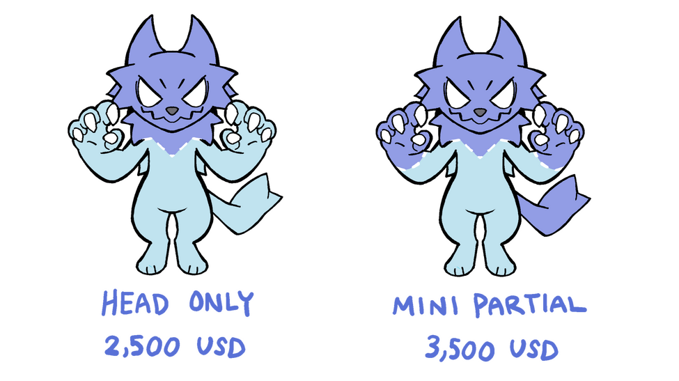 Pricing is highly dependent on the character design provided. Follows the complexity model. more fabrics used / more markings = higher pricePrice Guide can be found HEREFull partials and Fullsuits are not offered at this time as I require more experience before offering them as commissions. stay tuned for future openings if interested in fullsuits!Commission process:All commissions will begin with the concept art stage, your character will be drawn in my style and planning will occur during this stage (such as determining which fabrics will be used and extra details the buyer may have)A custom 3d modeled headbase will be created for each character and will remain unique to said character. Bases will NOT be reused once the commission is completed.Headbases are printed in flexible TPU material and are very durable (can withstand falls, bumps, or squishing).Once printed, the base will be lined and taped for patterning. This is where the process ends for customers utilizing a payment plan. Progress will only be made after this once the full payment is made.I am open to changes during the modeling process and it is crucial that any concerns should be voiced. Once the base is printed, there will be NO alterations to the shape of the fursuit.Due to limited experience, I may choose to experiment on certain aspects of the suit free of charge and with the buyers approval (example: trying a new species, detailed mouth/maw, different style of lining or sewing, etc).Artistic liberty suits are +$1,500 USD above base prices. will include concept art, reference, and a badge artwork of the new design. A small description or moodboard is required for artistic liberty (so the buyer still has some choice in what they receive)A 40% non refundable deposit is used for artistic liberty designs. This will enable the buyer to keep the created design if cancelation is requested. (this ONLY includes the concept artwork and character reference. Any fursuit parts in progress will NOT be sent and it will be altered to be used elsewhere if canceled.)